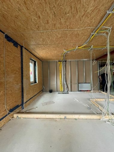 Wände sind das eine, das andere das wichtige Innenleben. Heizungs-, Lüftungs-, Sanitär- und Elektroinstallationen wurden von den Firmen Windmüller aus Schwäbisch Hall, Henkel aus Heilbronn sowie Nothelfer + Schumacher aus Ellhofen verlegt. Sobald diese Arbeiten abgeschlossen sind, können die Trockenbauwände verschlossen werden.