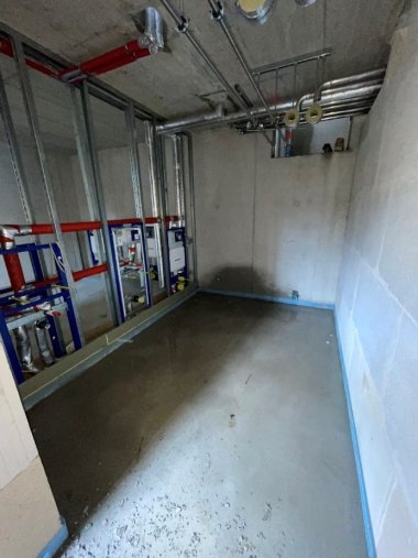 Das war es aber noch nicht in Sachen Technik. Der Estrich im Untergeschoss des Anbaus, eingebracht von der Firma Hägele Estriche aus Beilstein, stellt das Fundament für die weiteren Installationen der technischen Gewerke im Technikraum dar. Auch der Nahwärmehausanschluss ist bereits verlegt, sodass der Estrich in den anderen Geschossen bereits mit Wärme aus dem Nahwärmenetz der Neuen Ortsmitte aufgeheizt werden kann