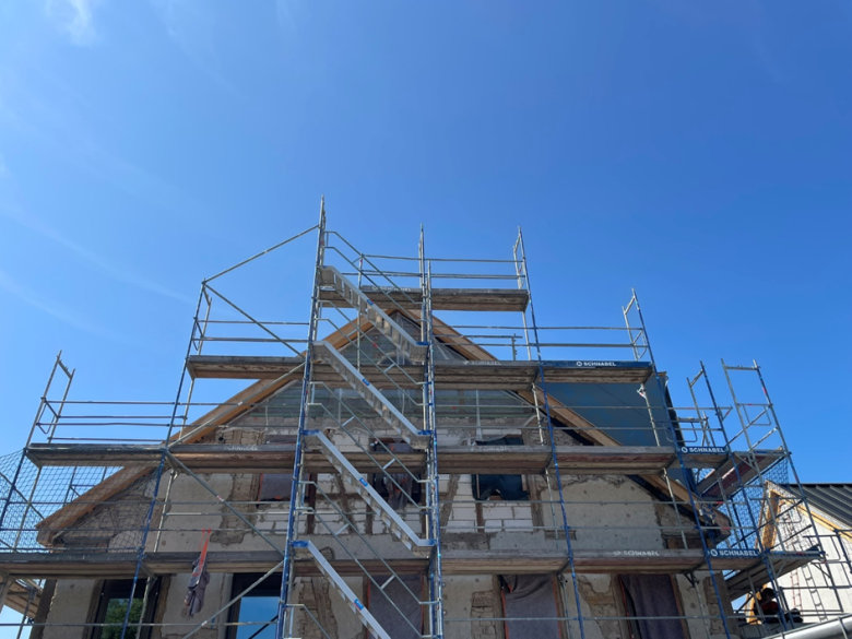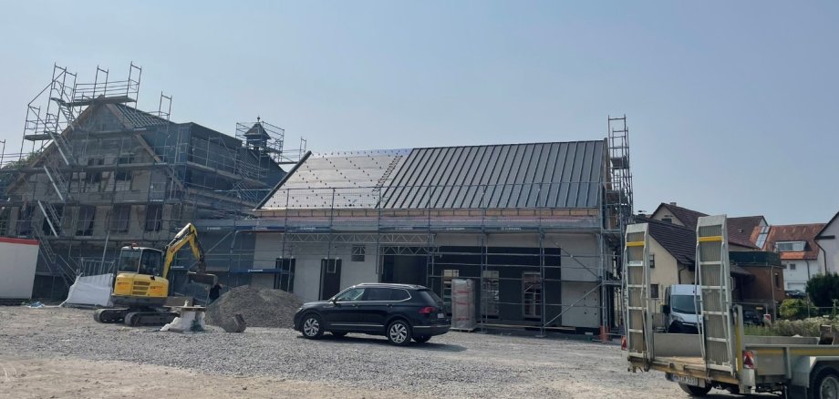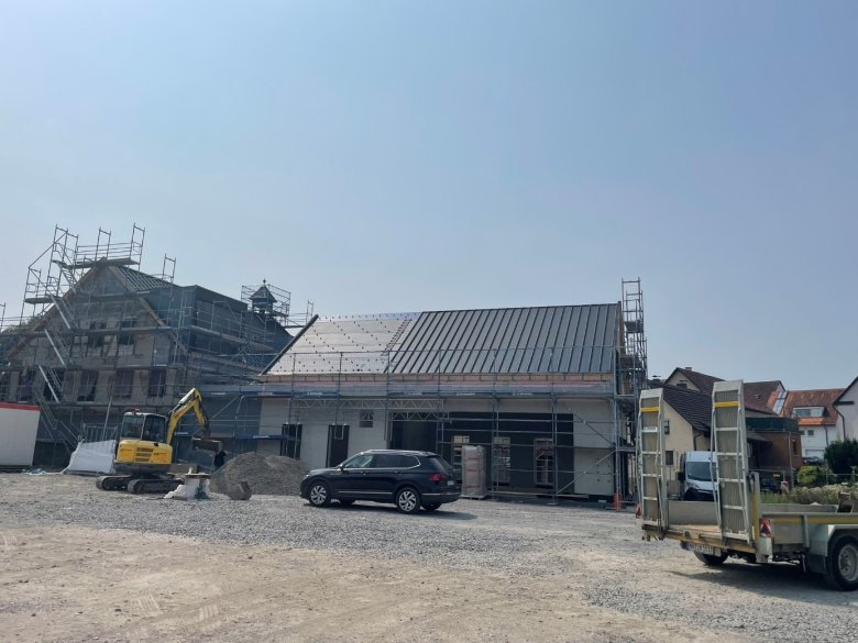Gearbeitet wird auf mehreren Ebenen. Erfreulicherweise konnte auch das Dach der Firma Scholl Holzbau aus Weinsberg auf dem neuen Anbau mit den Kalzipbahnen eingedeckt werden, sodass die Photovoltaikanlage im September aufgebaut werden kann. Dieser Strom wird dann auch im Arealstromnetz und damit den angeschlossenen Gebäuden der Ortsmitte zur Verfügung stehen. Dazu gehören die Gemeindehalle, die Grundschule, die Kita und das Bürgerhaus.