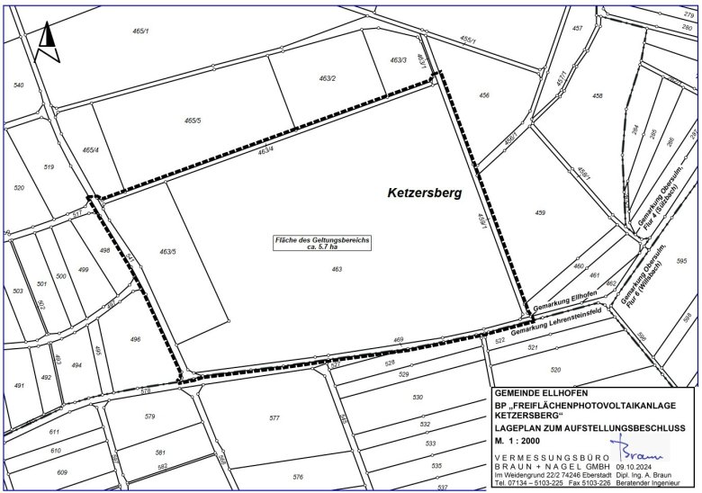 Für den Planbereich „Freiflächenphotovoltaikanlage Ketzersberg“ ist der im Lageplan des Ingenieurbüros Braun + Nagel GmbH vom 9. Oktober 2024 dargestellte Geltungsbereich maßgebend. Er ergibt sich aus dem beigefügten Kartenausschnitt.