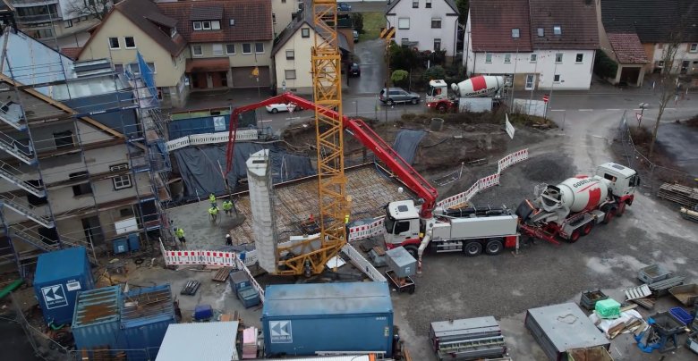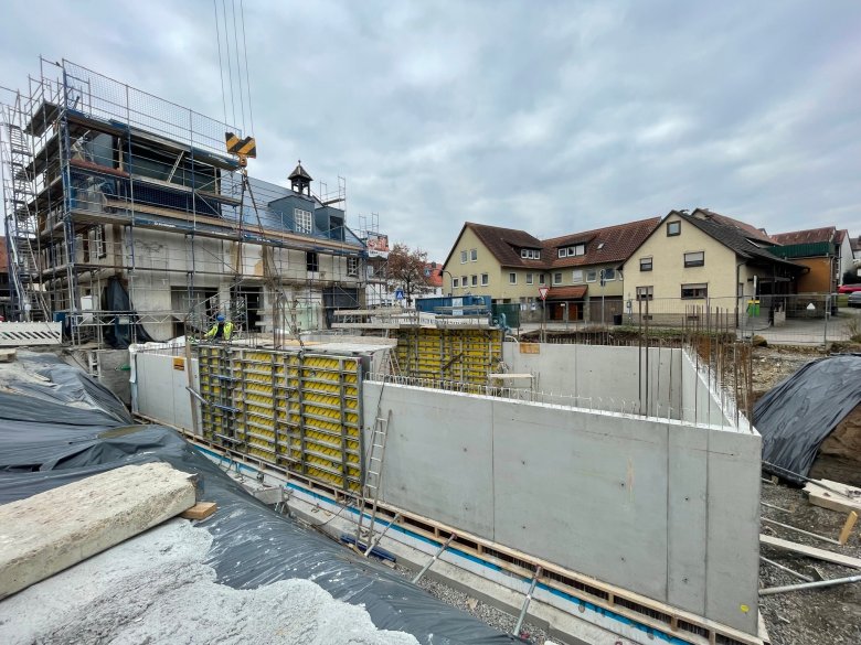 Der neue Rathausanbau wächst Schritt für Schritt aus dem Boden und wird in den kommenden Monaten Gestalt annehmen. Ende Februar wurde die Bodenplatte betoniert. Die Firma Karl Köhler aus Besigheim hat die Verschalung für die Außenwände des Kellers bereits angebracht, damit auch diese nun Stück für Stück betoniert werden können. Parallel arbeitet die Firma Hydraton daran, den Keller wasserdicht zu machen. Im nächsten Schritt werden demnächst die Innenwände im Keller gemauert. Anschließend erhält der Keller seine Decke und damit das Erdgeschoss den Boden. Geplant ist, die Erdgeschossfußbodenplatte Anfang April zu betonieren. Daran schließen sich die Rohbauarbeiten des Anbaus für Außen- und Innenwände an. Zudem werden nun die Kalzipbahnen auf dem Dach des Bestandsrathauses von der Firma Scholl gemeinsam mit der Firma Gebrüder Rückert angebracht.